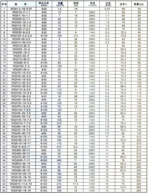 WQ型系列無(wú)堵塞潛水泵是根據(jù)九五年國(guó)家專利技術(shù)生產(chǎn)的新型離心泵。該泵在設(shè)計(jì)上綜合地吸收了瑞典科學(xué)的葉輪水力設(shè)計(jì)和西德合理的整體結(jié)構(gòu)、快速的安裝技術(shù),以及日本完整的保護(hù)裝置和先進(jìn)的機(jī)械密封,效率高,能耗少、運(yùn)行可靠。泵的性能、結(jié)構(gòu)、安裝尺寸和技術(shù)要求均符合中華人民共和國(guó)城鄉(xiāng)建設(shè)行業(yè)標(biāo)準(zhǔn),因此在國(guó)內(nèi)排水排污行業(yè)得到了廣泛的應(yīng)用。